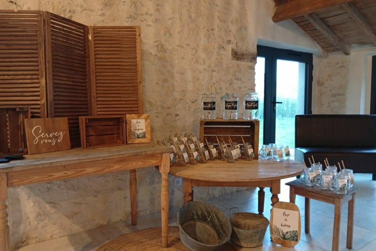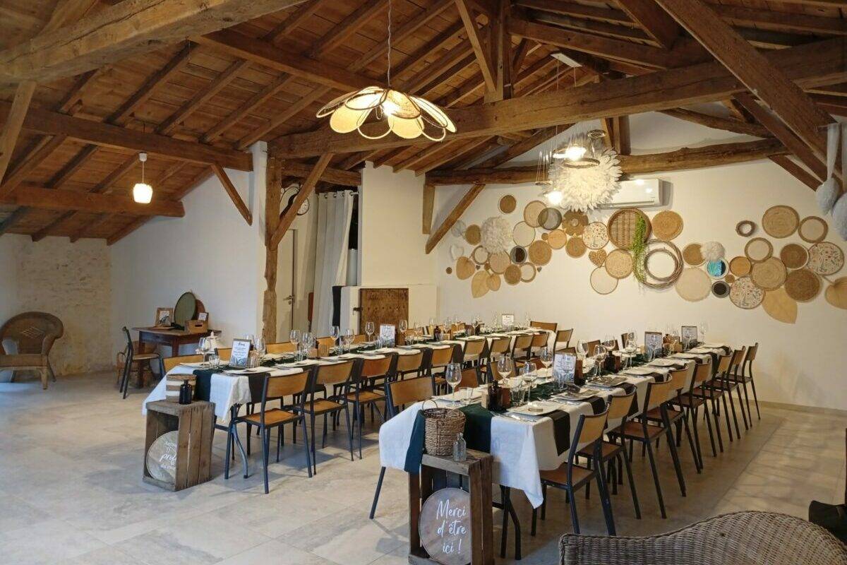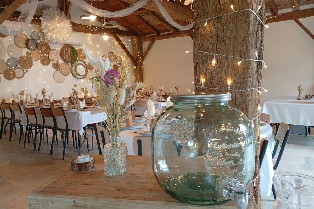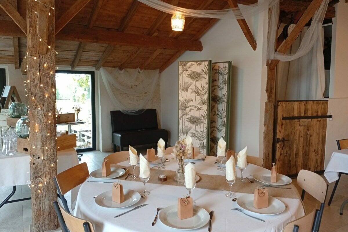 notre magnifique salle de réception est une ancienne grange en pierres apparentes rénovée en 2024 située sur un terrain arboré, offrant une ambiance élégante et sereine pour vos événements.